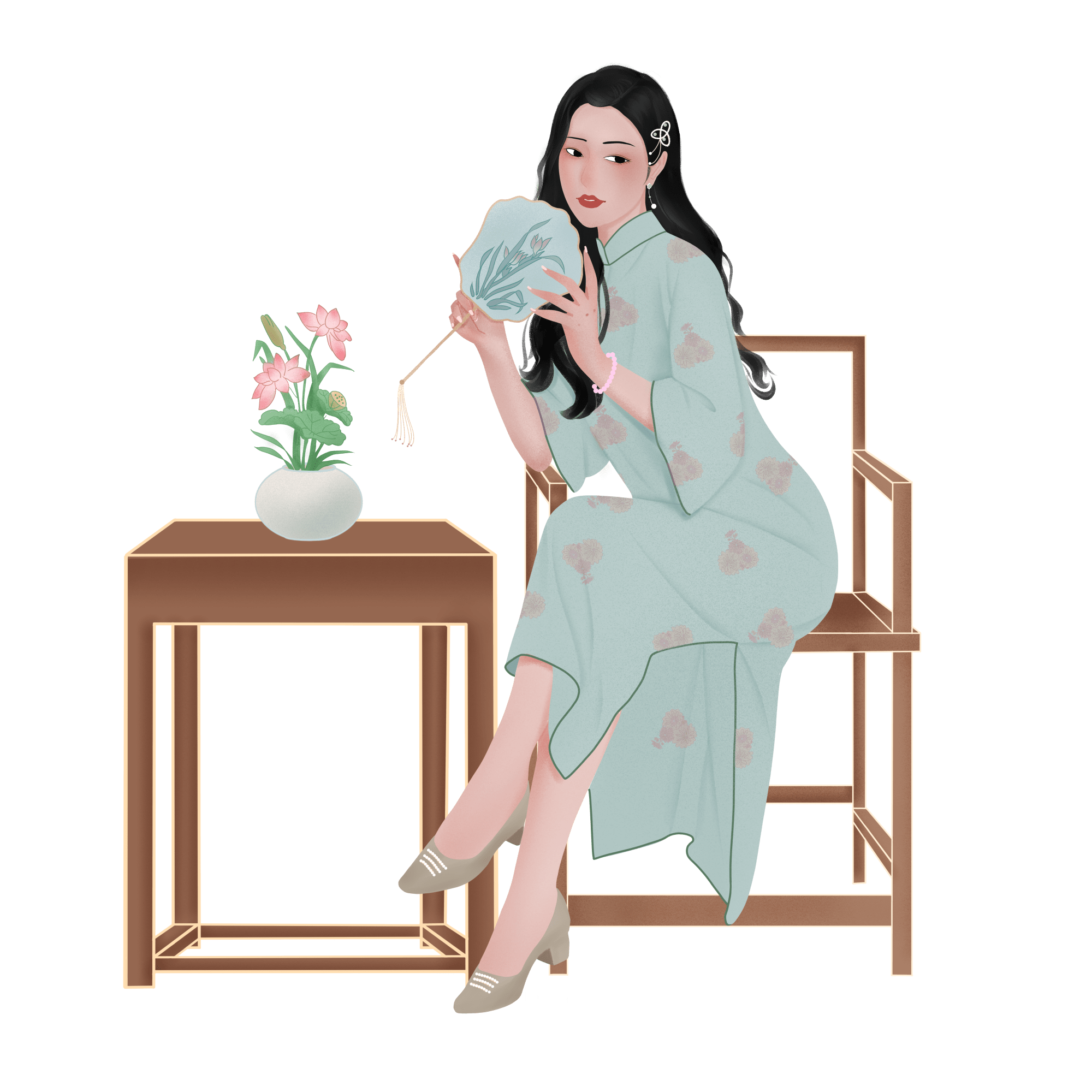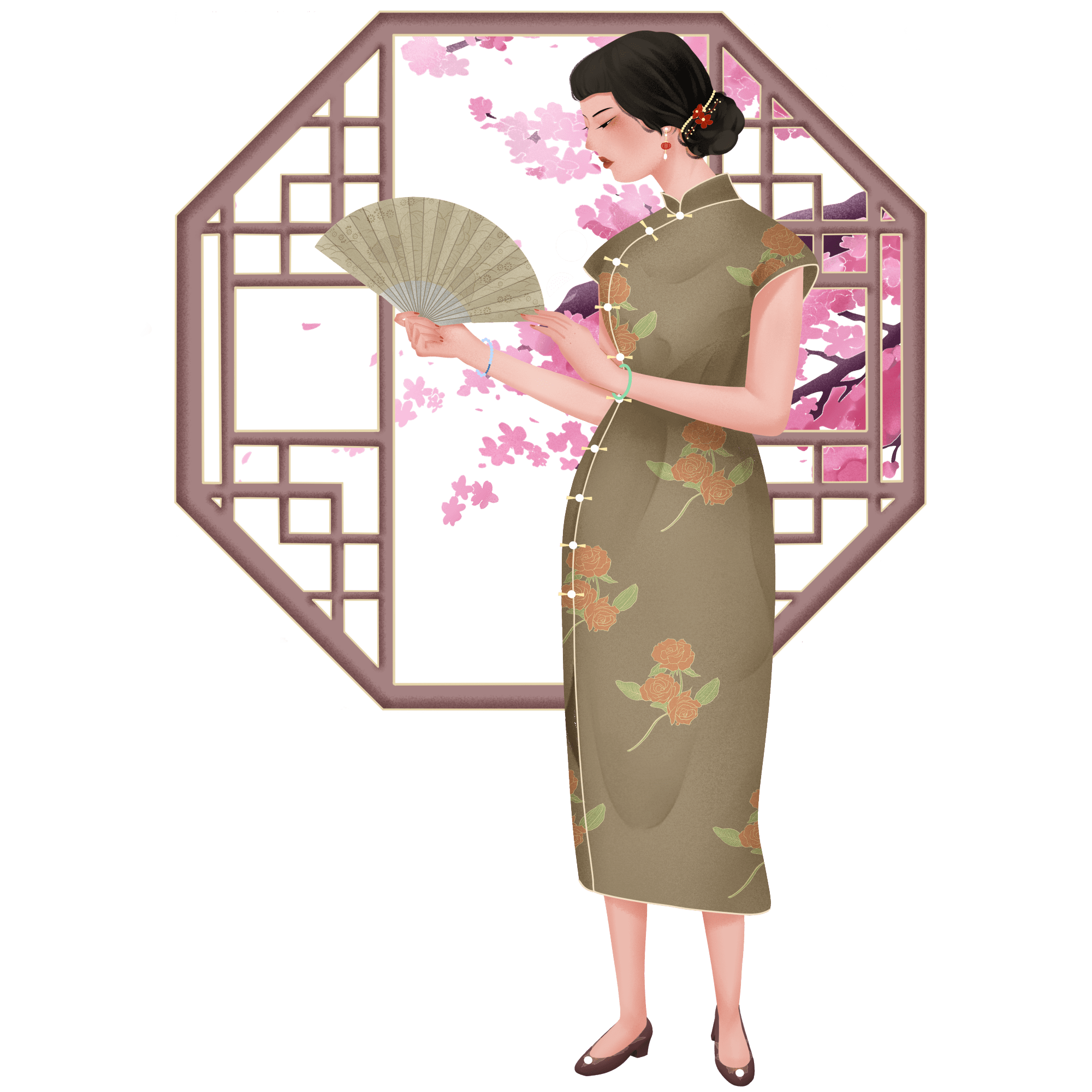 手绘-民国风旗袍女性人物插画贴纸1