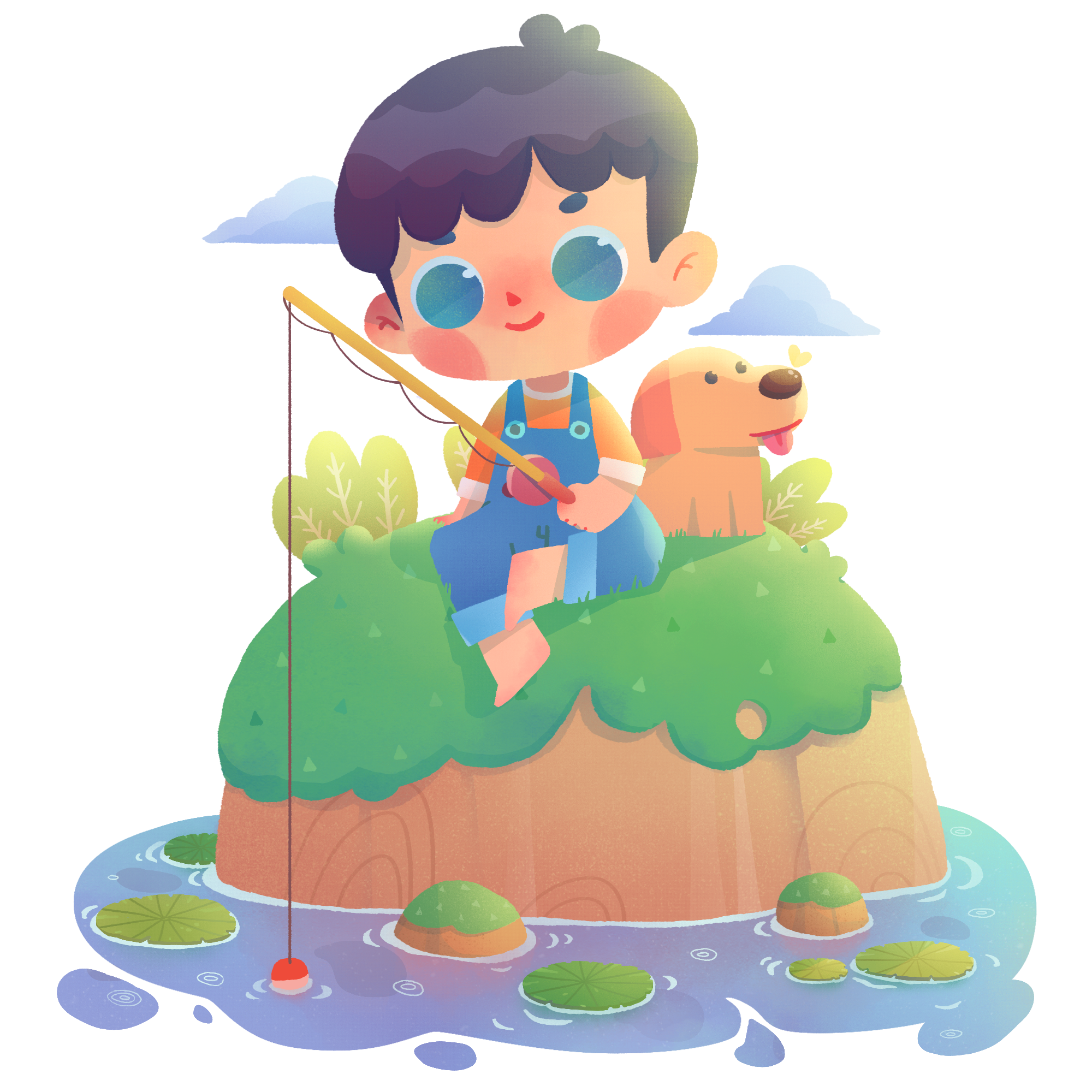 手绘-儿童玩乐场景插画-钓鱼