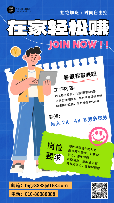 暑假兼职招聘卡通风手机海报