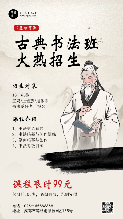 古典书法班教育培训水墨风招生海报