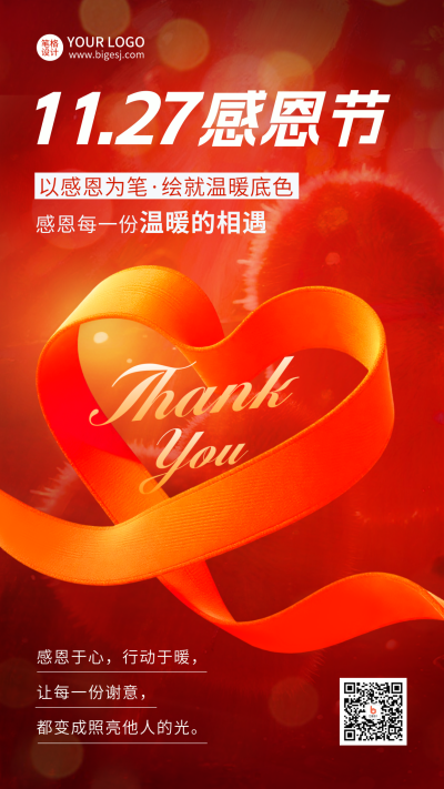 感恩节祝福红色丝带宣传海报