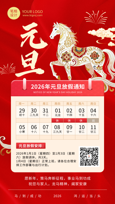 马年元旦节放假通知祝福宣传海报