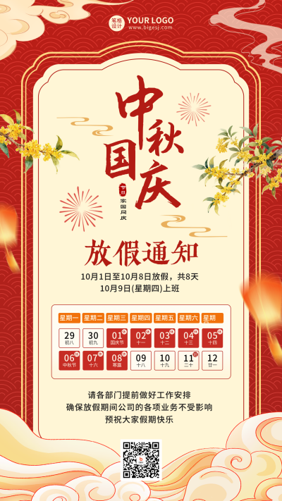 中秋国庆放假通知红色海报