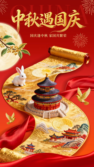 中秋国庆创意刺绣风海报