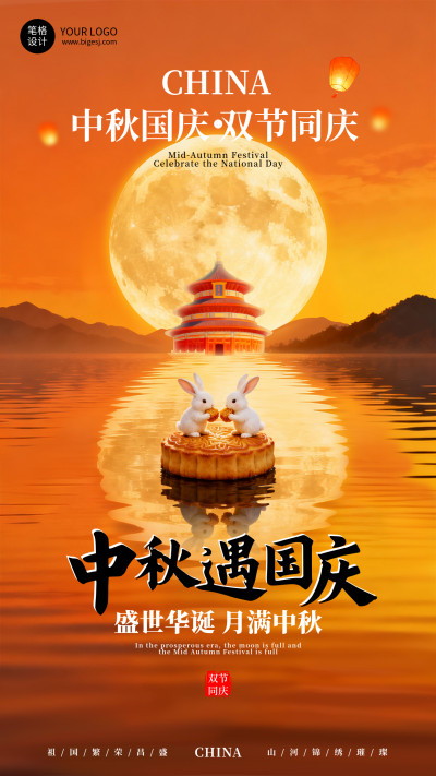 橙色3D中秋国庆双节海报
