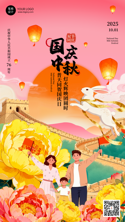 粉色扁平中秋国庆双节海报