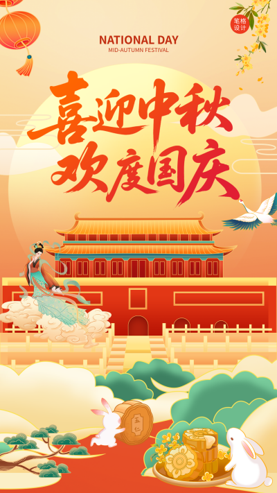 红色插画风中秋国庆双庆海报