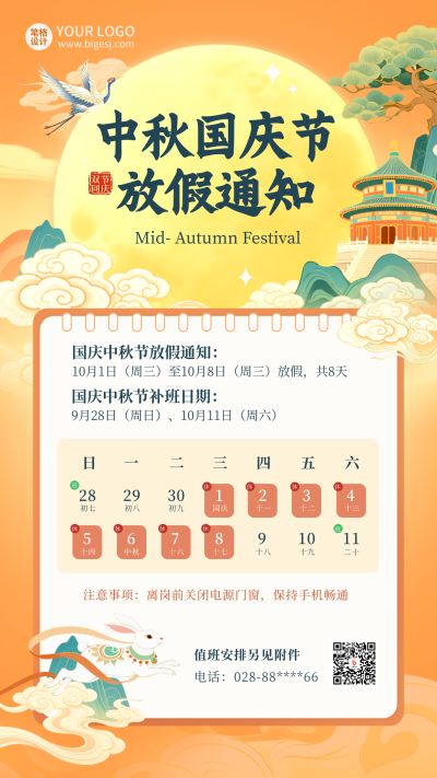 国庆节中秋节放假通知宣传海报