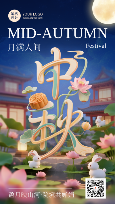 中秋节3D祝福蓝色简约宣传海报