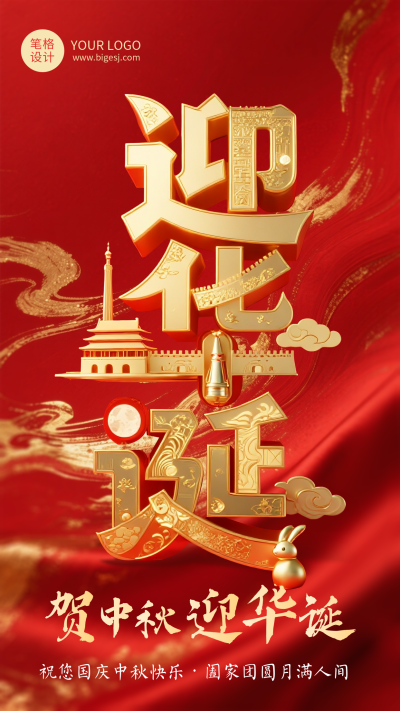 中秋国庆节3D祝福红色大气宣传海报