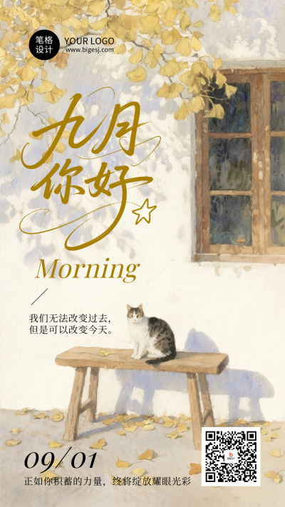 九月你好日签简约治愈手机海报