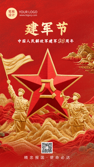 八一建军节红色大气刺绣风祝福宣传海报
