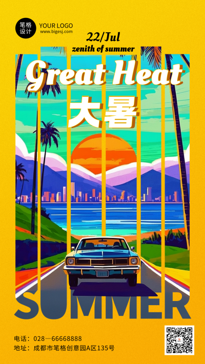 大暑节气祝福简约插画橙色海报