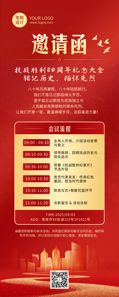 抗战胜利80周邀请函红色简约长图海报