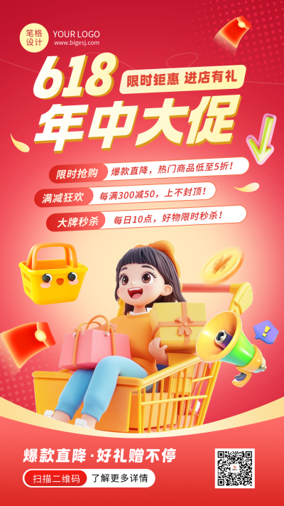 618年中活动促销3D卡通红色海报