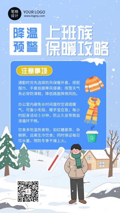 蓝色插画风降温提醒海报