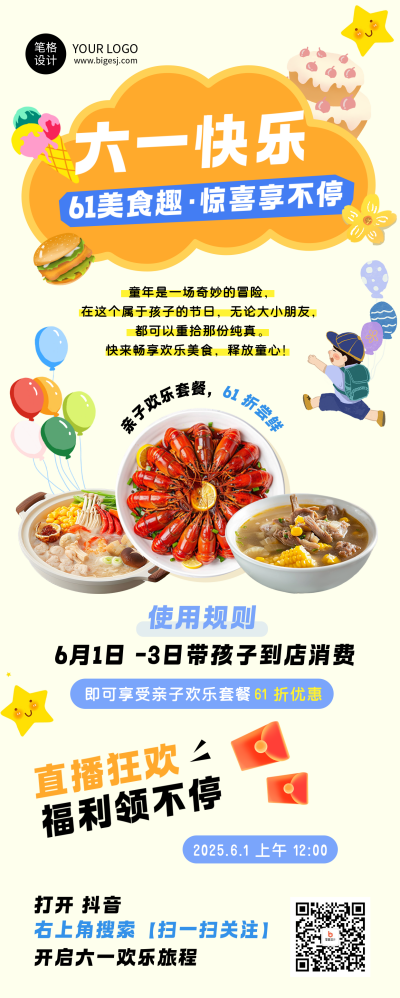 六一儿童节餐饮促销活动简约长图海报