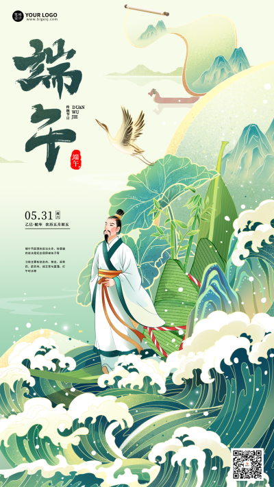 端午节手绘古人祝福宣传海报