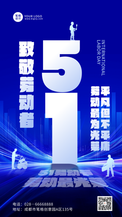 五一劳动节蓝色科技风祝福宣传海报