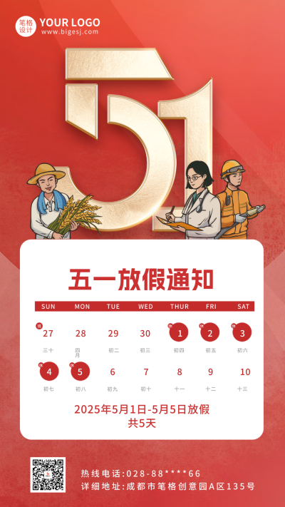 五一劳动节放假通知手绘宣传海报