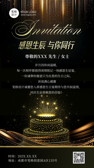 生日祝福简约商务风黑金海报
