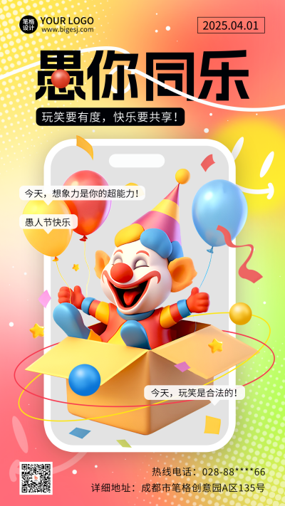 愚人节3D可爱趣味手绘海报
