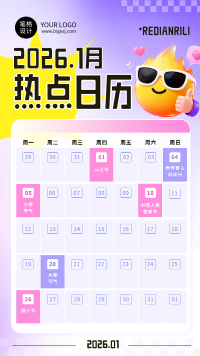2026热点日历简约宣传海报