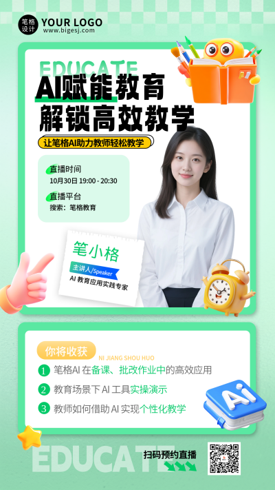 绿色简约AI辅助教育工作效率提升直播宣传海报