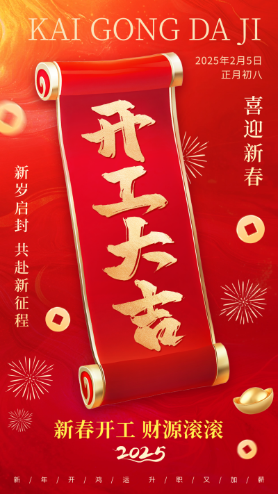 开工大吉红色卷轴祝福海报