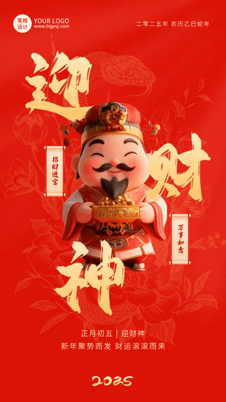 3D新年传统习俗正月初五迎财神祝福动态海报