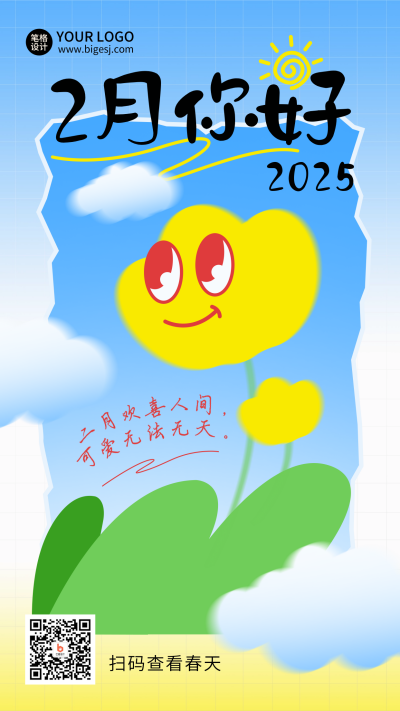 2月你好问候语励志日签趣味渐变海报