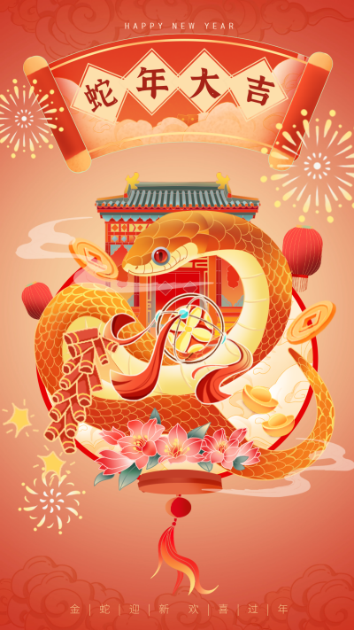 蛇年春节手绘新年祝福宣传海报