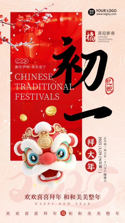 春节传统习俗正月初一舞狮头海报
