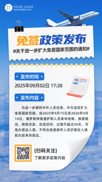 蓝色简约免签政策通知海报