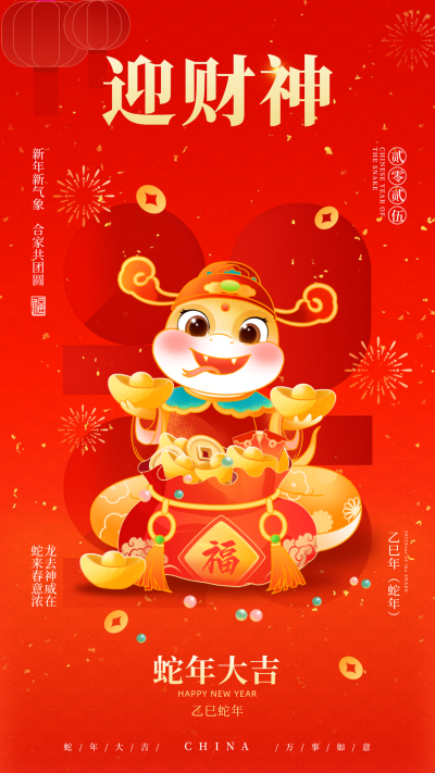 蛇年春节新年正月习俗迎财神手绘宣传海报