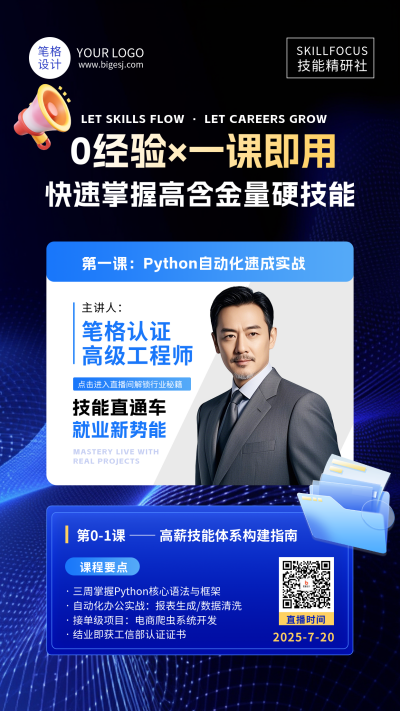 技能培训讲师直播蓝色科技简约海报