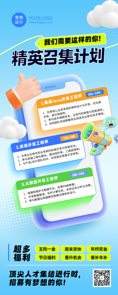 求职招聘蓝色简约3D长图海报